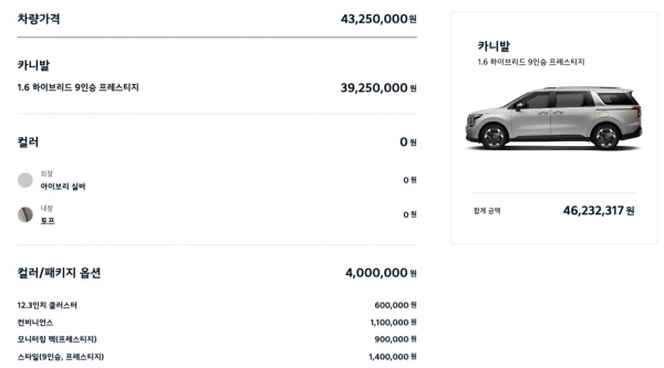 - 7인승: 시작 가격 4520만원, 승용차 분류로 조금 더 우수한 기본사양 제공.