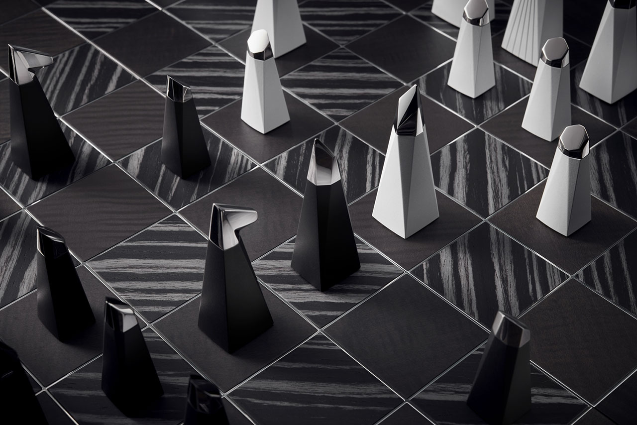 체스 말들은 또 어떻고요! 각 피스가 그 자체로 하나의 조각 작품 같아요. 전통적인 체스 말의 실루엣을 현대적으로 재해석하여 아래로 길게 뻗어 정사각형 받침대와 자연스럽게 이어지도록 디자인했죠. 몸체는 세라믹 코팅된 알루미늄으로 만들어졌고, 꼭대기에는 보석처럼 빛나는 금속 헤드가 장식되어 있어요.