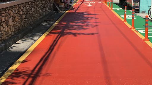 이 문제는 도로 표면 처리 방식에서 비롯됩니다. 빨간색으로 칠해진 미끄럼 방지 도로는 수직의 표면 처리라는 방식으로 제작되는데, 이 방식이 시간이 지나면 알갱이가 없어지면서 페인트만 남게 되어 오히려 더 미끄럽습니다. 특히, 비가 오면 물이 빠지지 않아 수막현상으로 인해 사고 위험이 커집니다.
