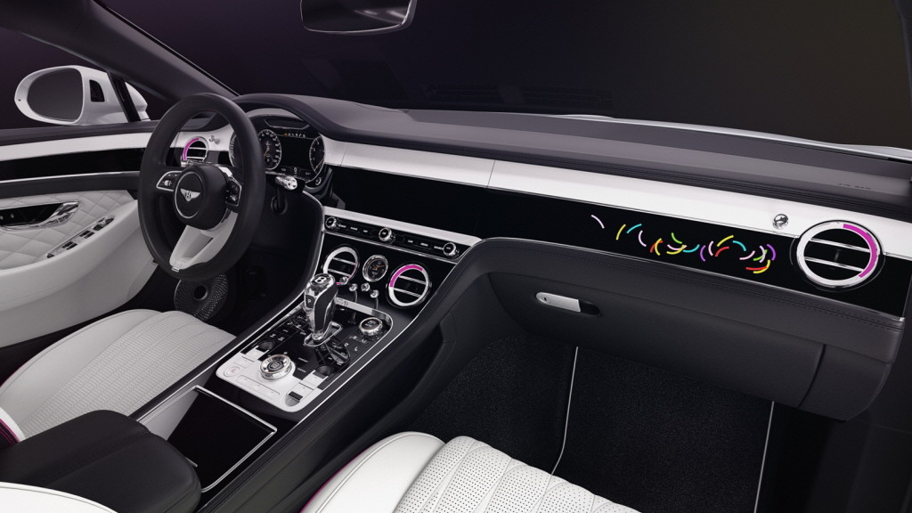 하태임 작가와 벤틀리가 손을 잡고 만든 이 차는 단순한 이동수단을 넘어서 예술작품으로도 손색이 없습니다. 작가의 시그니처 컬러밴드가 실내 곳곳에 녹아있어, 한눈에 보기만 해도 '아, 이것은 하태임 작가의 작품이구나'라고 느낄 수 있습니다.