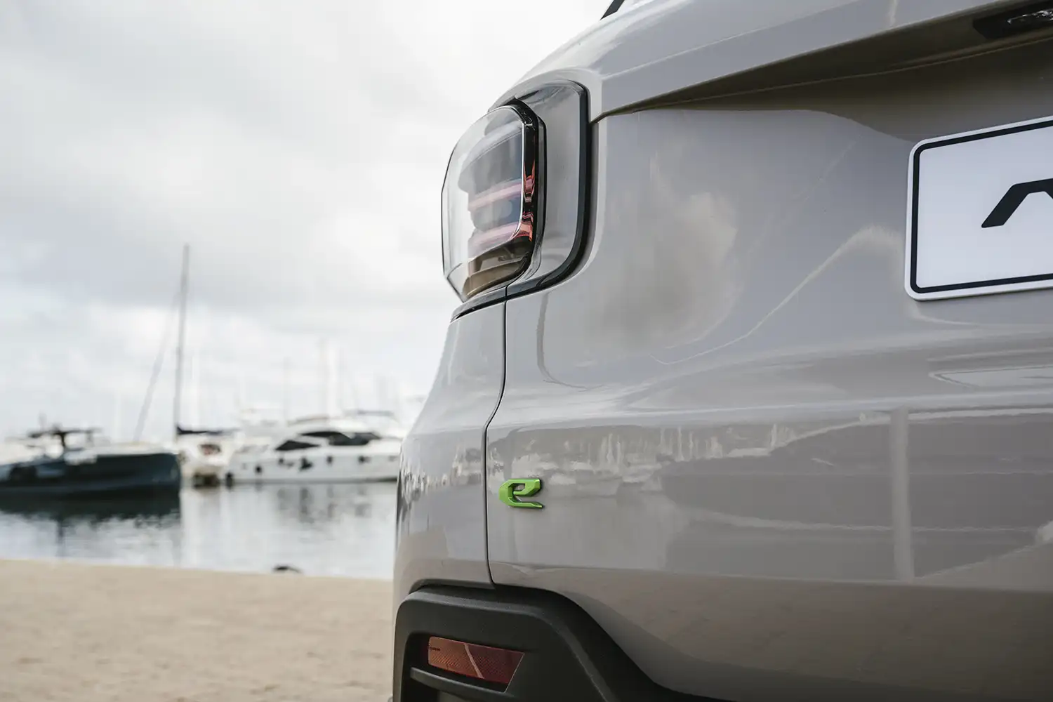 외관의 특징: 녹색 'e' 엠블럼으로 전기차의 특성을 강조했으며, 현대적인 디자인이 돋보입니다.