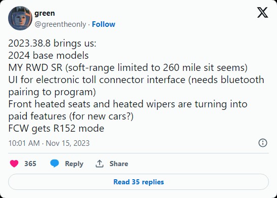 해커 그린이 자신의 SNS 계정을 통해 공유한 2023.38.8 버전의 소프트웨어 업데이트 내역에 따르면, 테슬라는 신차에서 앞 좌석 열선 시트와 앞유리 와이퍼 열선을 유료 기능으로 전환할 것으로 보입니다. 이는 테슬라가 차량 내장 하드웨어의 소프트웨어 잠금에 익숙한 브랜드라는 사실을 다시 한번 확인시켜 주는 움직임이죠.