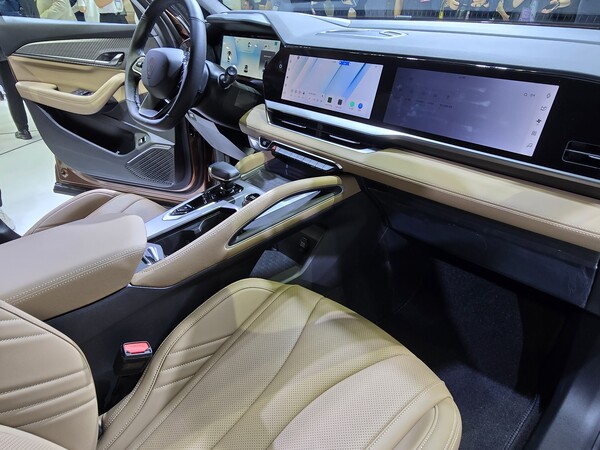실내는 정말 "와, 이건 고급스럽다!"라는 말이 절로 나올 정도였어요. 12.3인치 디스플레이 3개가 나란히 배치된 인테리어는 미니멀리즘을 잘 살렸어요. 대시보드의 알칸타라 소재와 프랑스 국기 색상을 적용한 스티치는 고급스러움을 한층 더해줍니다. 다만, 수납공간이 부족하다는 점은 조금 아쉬웠어요. 특히 컵홀더가 작아서 큰 텀블러나 페트병을 놓기가 어려웠습니다.