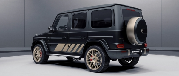 외관은 무광 검정의 마누팍투어 컬러가 적용되었고, 측면 도어 하단에 골드 색상의 AMG 그랜드 에디션 필름이 더해져 강렬한 시각적 대비를 줍니다. AMG 로고와 메르세데스-벤츠 삼각별 로고에도 골드 색상이 최초로 적용되었습니다. 22인치 AMG 단조 휠, 보닛 위 아팔터바흐 엠블럼, 후면 스페어 휠 테두리 등도 골드 색상으로 마감되었습니다.